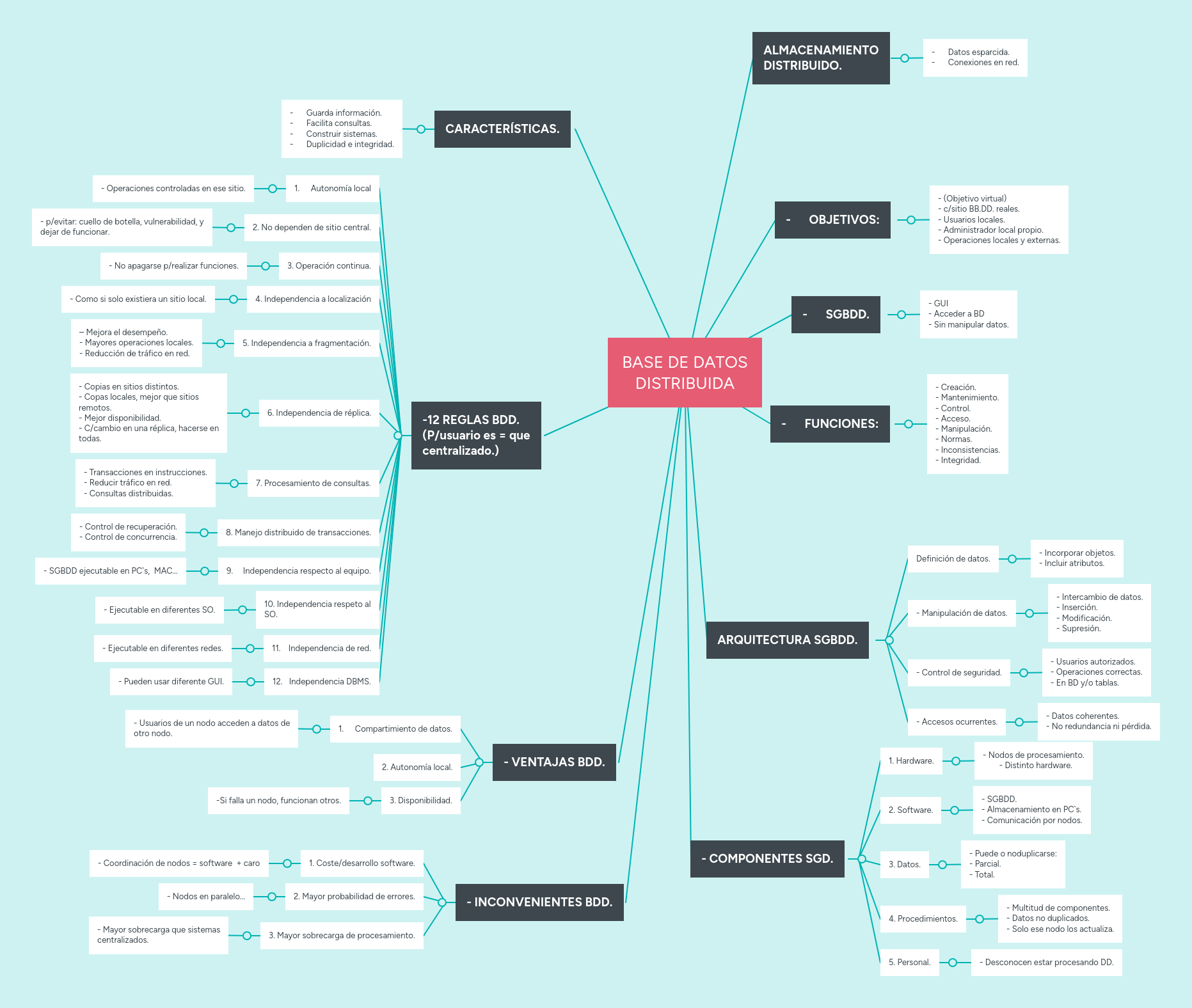Se ocupa tener una buena conexión para la conexión de los diferentes nodos y es parte fundamental del sistema cliente servidor. Igual que si fuera centralizada. En la arquitectura distribuida el sgbd y la bd no están asociados a un determinado ordenador, sino a una red cuyos nodos se reparten las funciones.. Una base de datos distribuida es vista por las aplicaciones igual que si fuera centralizada.